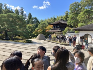二つ目の見学地銀閣寺へ。たくさんの学校と合流しましたが、足利義政の思いのこもった庭園を見てまわりました。『落ち着くわぁ』と話している子もいました。