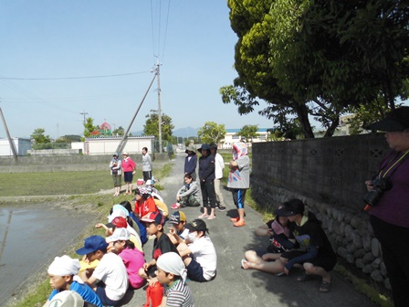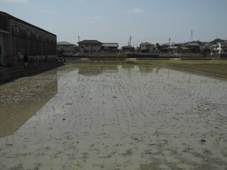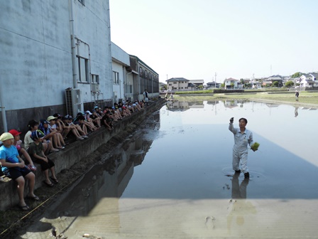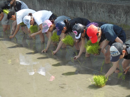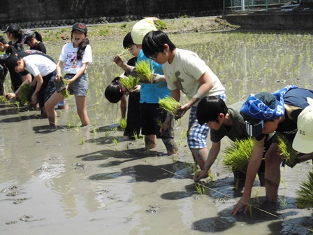 初めにJAの方に植え方を指導していただき,ワイワイ,ギャーギャー言いながら田んぼの中に入っていきました。最初は,1列植えるのに5分くらいかかっていて,「こんなんで最後まで行けるのかなぁ・・・」と心配になりましたが,徐々にペースも上がり,3時間目の始まるころには,すべて植え終えることができました。途中田んぼの中にしりもちをついてしまう子もいましたが,とても楽しく活動できました。お世話になった方々,ありがとうございました。