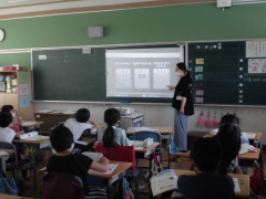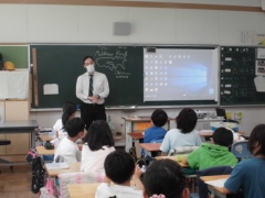 今日はHEFのアーリン先生のピンチヒッターとしてマシュー先生に来ていただきました。「誕生日はいつですか?」「好きな色は何ですか?」「日本へは何年前に来たのですか?」など様々な質問をすると英語で答えてくれました。子どもたちは生の英語をしっかり聞き取ろうと耳を傾け、「ジュライって・・何月やったっけ?」「フォーティって14?40?」