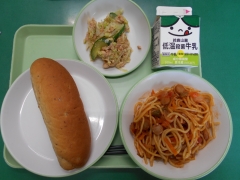 ★今日の給食はイタリアンスパゲッティとツナサラダでした。スパゲッティの中にはみじん切りにしたにんにくが入っているそうです。にんにく効果で、味に深みが出ていました。