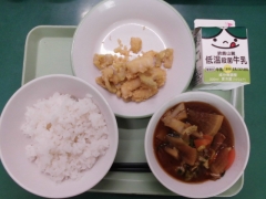 ★今日の給食はいかとれんこんのさらさ揚げと豚汁でした。さらさ揚げとはカレー粉や調味料で下味をつけて、粉をまぶして揚げたものです。仕上がりの色が、東南アジアの「更紗」という織物に似ていることから、この名前が付けられたそうです。今日の色は薄めでしたが、子どもたちには大人気でした。