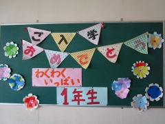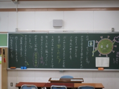 教室の黒板には、各担任が思いをこめて子どもたちへのメッセージをつづっていました。
