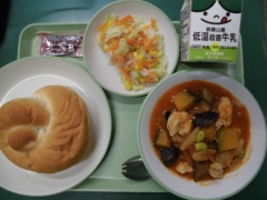 ★今日の給食は鶏肉と夏野菜のトマト煮とコールスローサラダとメープルジャムでした。「今日のお誕生日の日にジャムがついていてうれしい!」と話していた1年生がいました。米粉パンにメープルジャムを付けて美味しそうに食べていました。