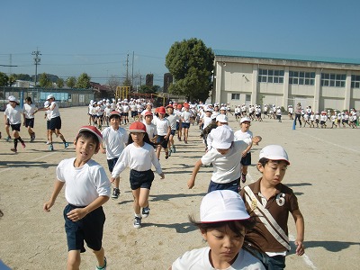 準備体操をした後、初めの1分間はクラスでそろって走ります。