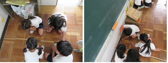 「教室のたての長さ」を調べるために,最初は定規を使っていました。友だちの定規やものさしを集めて測っていましたが,正確に長さを調べることができませんでした。しかし,「巻尺」を紹介した後では,「まっすぐ!」「ひっぱって」「そこ浮いているよ」と声かけをしながら,長さを測ることができました。