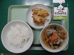 ★今日の給食はかき揚げとキムチ鍋でした。キムチの辛さも給食では抑えられていました。具だくさんのスープで、心も体も温まりました。