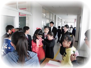朝、登校すると受付で、卒業生の胸に花を飾りお祝いをしました。
