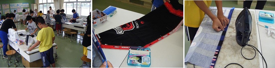 家庭科の学習では,ミシンを使ってエプロンづくりをしています。自分の体の大きさに合うようにエプロンを切り,待ち針で止め,仮縫いをし,ミシンで丁寧に縫っています。初めて取り組むミシンには,スピードが速くまっすぐ縫うことができなかったり,下糸がなくってしまってやり直しをしたりと困りながら作業を進めています。しかし,困りながらも友だちに手伝ってもらったり,ボランティアの方に助言をいただきながら日々成長しています。完成後には,マイエプロン鑑賞会も予定しています。エプロンを身につけたみんなの喜ぶ顔が今から楽しみです。