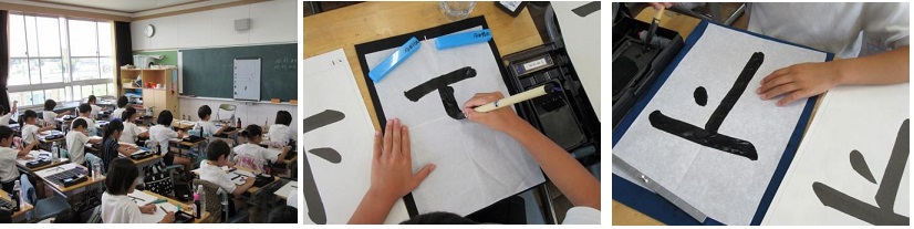 3年生になって毛筆の学習を始めました。何度か繰り返し練習しているので,準備や片付けは,早くできるようになりました。今日の学習は,「下」です。「書き始め」を意識し,「止め」に気を付けて書くことができました。