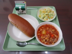 今日の給食は、「黒糖パン・牛乳・チリポークビーンズ・コーンサラダ」です。大豆は、体をつくるもととなるたんぱく質を多く含み。唐辛子を使ったピリっと辛いトウバンジャンで味付けをしていただいたチリポークビーンズ、美味しくいただきました。ごちそうさまでした。