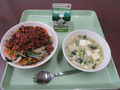 今日の給食は、「肉みそビビンバ・牛乳・卵スープ」です。いつものビビンバとは違い、今日はミンチ状の肉にみそがからめてあり、通常のビビンバとはまた違った感覚で美味しくいただきました。ごとそうさまでした。