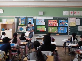 ◇1学期に全学年の図工で取り組んだ人権ポスター。今日は「友だちの作品を見て、よさや美しさ、表現の工夫を感じ取ろう」というめあてで、お互いの作品を鑑賞しました。「背景の色使いがきれい」「標語がわかりやすい」など、色々な意見が出ていました。