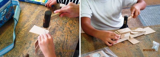 図工科では「トントンドンドンくぎ打ち名人」の学習をしています。木材を用いてくぎ打ちに挑戦しています。厚い木や薄い木,さまざまな形を組み合わせて作品を仕上げています。初めはうまく打てず,くぎが曲がったり,打ちこんだ釘が飛び出したりしてしまう子がいましたが,それも経験です。くぎを抜いて打ち直したり,桐で穴をあけてまっすぐ打てるように取り組んでいます。作品が出来上がるのが楽しみです。