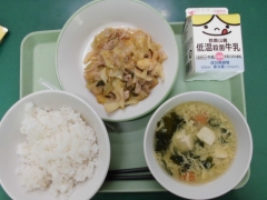 ★今日の給食は豚キムチと卵とわかめのスープでした。中華のおかずはご飯がすすみます。豚キムチはあまり辛さを感じなかったので、辛さが苦手な子もしっかり食べていました。