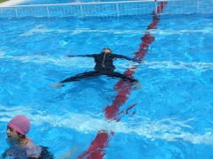 ★服を着て泳ぐことの大変さを体感した後、実際におぼれたときにどうすればいいのかを具体的に教えていただきました。