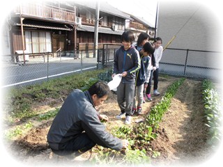 今日の理科の時間に、学習園で栽培した小松菜の収穫をしました。