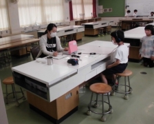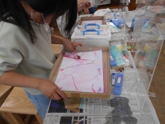★4年生がとても楽しそうにビー玉を転がしながら、模様を描いていました。段ボールの枠を利用して、転がします。ビー玉は予想外の動きをするので、素敵な模様が出来上がりました。