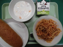 ★今日の給食は大豆入りスパゲッティミートソースとフルーツヨーグルトでした。スパゲッティはお箸を使って食べましたが・・真っ赤なお口で「ごちそうさまでした!」