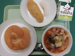 ★今日の給食は白身魚フライ、ミネストローネ、梨でした。「学校の揚げ物っておいしいよな。カリッと揚がっているもん」と3年生の子が話していました。今日の白身魚フライもとてもおいしかったです。梨は四日市産。旬のものが食べられる幸せを感じます。ごちそうさまでした。
