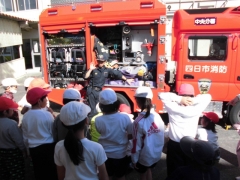 ★煙体験や水消火器訓練、消防車の見学などクラスに分かれて学習しました。