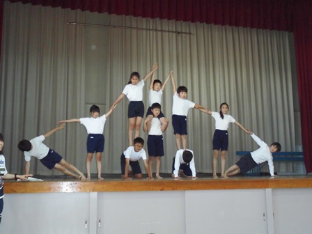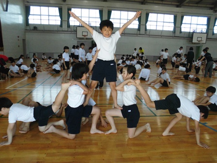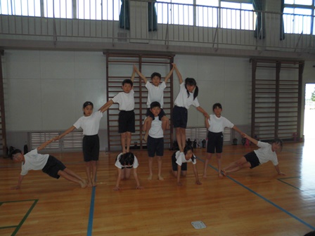 そして,先週の木曜日あたりから,いよいよ5・6年生の合同練習が始まりました。最初は,一人技や二人技といった比較的簡単な動きでしたが,今週からは5人~10人で作る大技に移行してきました。みんなの気持ちを一つにし,自分の体の上に人が乗る子は,その重みに耐えながらも,相手の子が乗りやすいようにと気を使い,頑張って練習に取り組んでいます。まだまだ全体像は見えていませんが,完ぺきに出来上がるのがとても楽しみになってきます。