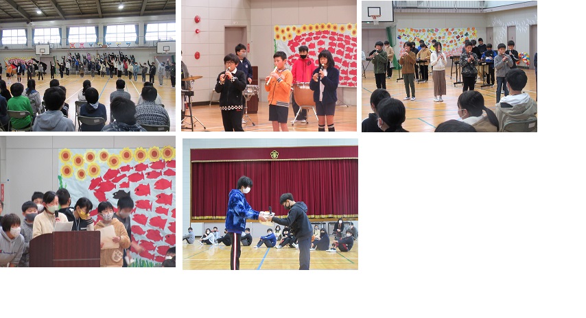 本番を迎えた送る会!これまで、体育館の掲示物や送る会の進行の準備など、さまざまな仕事をしてきた5年生たち。この日を迎え、「威風堂々」の演奏と6年生への呼びかけをしました。演奏は、体育館中に響き渡り、呼びかけのメッセージは6年生たちの胸に届く素晴らしい発表でした。校長先生からは、会の進行をきびきび進める姿や発表の出来や姿勢など、とてもすばらしいと褒めてもらいました。もうすぐなる6年生になる5年生の子どもたち。大きく成長できた一日でした。