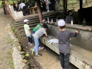 食べた後は片付け。今回は鍋、ザル、トングの3点しか借りませんでしたが、しっかり磨いて一発合格を目指しました。
