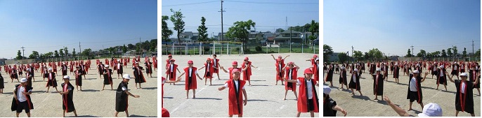 南中ソーランの練習を運動場でしました。さっそく長袢纏を来て踊ってみることにしました。新しい長袢纏に子どもたちは大張り切り。しかし,子どもたちは,体育館とは違った広さに少し困惑気味で,せっかく覚えた隊形もわすれてしまうこともしばしばありました。