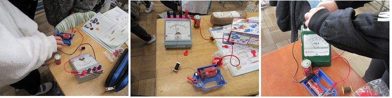 理科の学習では、電磁石の実験を行いました。電流計を使ってその電流の強さを調べています。コイルのまき数を変えたり、電池を2個使った直列つなぎをしてみたりしてそれぞれの電磁石のひきつける力を確かめました。