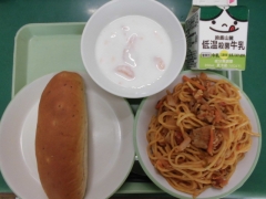 ★今日の給食は三重豚と大豆のトマトスパゲッティとみかん入りヨーグルトでした。今日のように暑い日は冷たいヨーグルトがとってもおいしいです。スパゲッティには細かく刻んだ大豆が入っていて、栄養満点!美味しくいただきました。