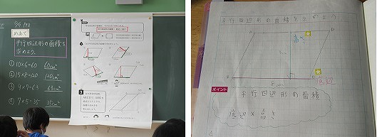 図形の面積を求める学習を進めています。これまで,正方形,長方形の面積の求め方を習ってきました。5年生では,平行四辺形や三角形,台形そしてひし形と習っていきます。図形を切って,移動させ,長方形をもとに公式を導き出していきます。子だちも楽しみながら面積を求める様子が見られました。