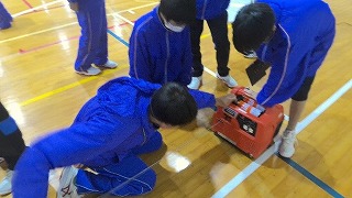 続いて、4か所に分かれて、体験活動をしました。防災倉庫の見学・発電機の始動・簡易トイレの組み立て・リアカーの組み立てなど、もしもに備えた行動を想定しながら体験をしていました。