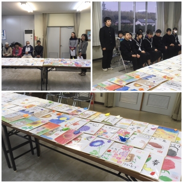 今日は神前市民センターで、平っ子が書いた年賀状の贈呈式がありました。この取組は、神前地区の独居老人の方に色紙を贈ろうと始まった三滝中の取組に、三重平中からも年賀状を送ろうということで仲間入りした取組です。この年賀状が皆さんに幸を運びますように・・・