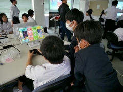 集中して描く姿が印象的です。描いたイラストについて話し合う場面も見られました。