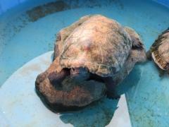 ロビーの青い”たらい”の中に亀がいました。カメラを向けると顔をこちらに向けてくれました。