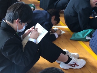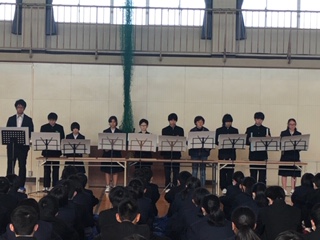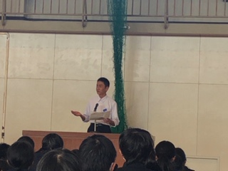 今日は、冬休みに書いた「主張作文」のクラスの代表者が全校生徒の前で発表しました。
