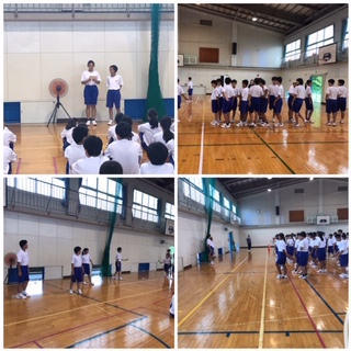 本日は雨のため、1年生は体育館で学年別練習を行いました。今回の練習の内容は、各チームのリーダーが放課後に何度も集まって話し合い、決めていたものです。中心となって声を掛け合い、内容を説明していたリーダーたちの姿はとても立派でした。はじめに行った大繩の練習では、朝練の成果もあってどのチームも記録をぐんぐんと更新しました。その後は、リレーのバトンパスを練習しました。