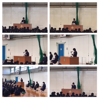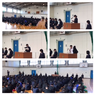 本日、6限目に体育館で主張大会が行われました。各クラスで選ばれた代表8名が全校生徒の前で「私の主張」を発表しました。興味のあることをしっかりと調べて、その内容だけでなく自分の考えをおりこみながら主張する姿がとても素晴らしかったです。まわりの生徒も真剣に聴き、その主張に対する自分の考えをしっかりと記入していました。クラスでの発表を含め、この主張大会を通じて一人ひとりが新しい発見や考えが生まれることを期待しています。