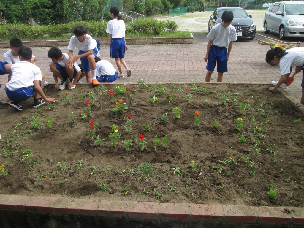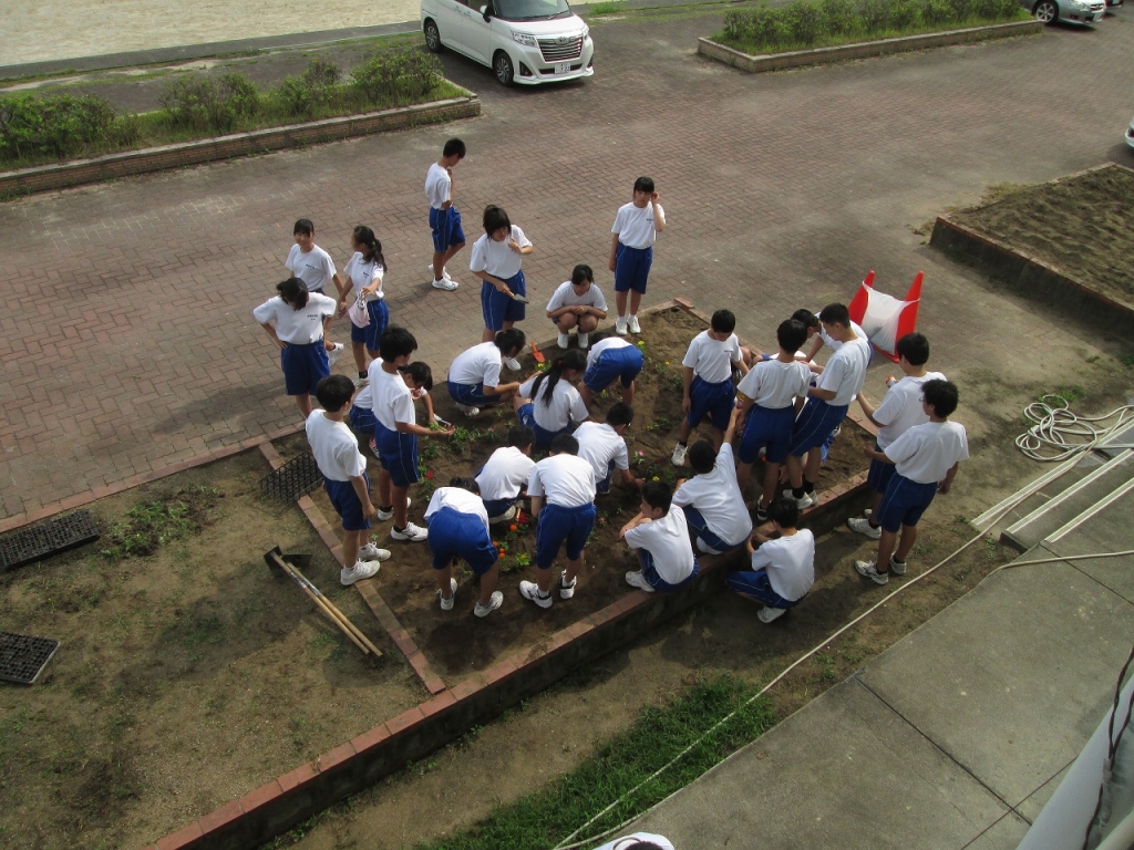 三重平には、各クラスの花壇があり、昼休みに草ぬきや水やりを行っています。