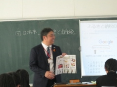 社会科の公民の税のしくみや公共サービスとマネジメントしながら実施しています。例えば、四日市学の方では、四日市により突っ込んだ内容を取り上げ、ふるさと納税と税の違いふるさと納税のしくみ返礼品の特色と種類など小学校から学んできた「ふるさと四日市」について改めて学ぶとともに四日市のふるさと納税の現状や課題など、自分たちとのつながりを意識した学習を実施しています。果たしてその現状は・・・