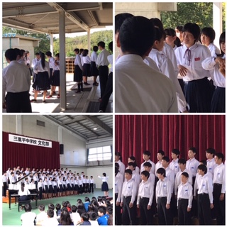 今日は文化祭が行われました。どのクラスも朝から意気込んでおり、最後の練習では学校中に歌声が響くくらい大きな声で練習していました。午前中は各クラスの合唱コンクールで、1年生から順に披露しました。壇上に上がった生徒たちからは緊張している様子がひしひしと伝わってきましたが、気持ちを込めて丁寧に歌い上げた合唱はどれもこころに強く響きました。午後に行われた桑名弦楽合奏団のみなさん、5組、音楽部、スピーチの発表はどれも見事で、夢中で発表を聞いていました。