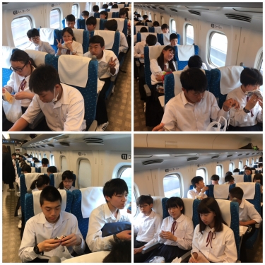 少し早い時間ですが、新幹線の中でそれぞれが持ってきたお昼ご飯を食べています。