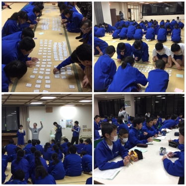 夕食の後は百人一首大会です。源平に分かれて一番風呂争奪戦をしました。上の句が詠まれると同時に札を取る生徒もいて、熱い戦いが繰り広げられました。結果は2組が一番風呂でした。