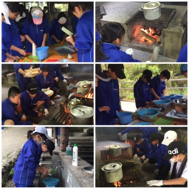 野外炊事が始まりました。防災について知るためにメニューはアルファ米と豚汁です。班で協力して頑張っています。