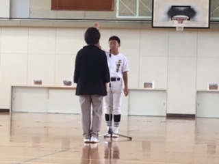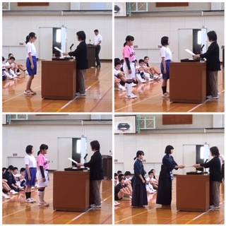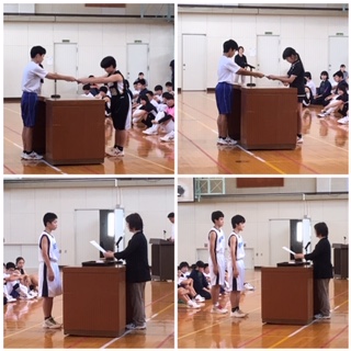 また、その後は表彰伝達を行いました。挨拶を元気に行ったり、本をたくさん読んだ人には、王の称号が与えられました。また、バスケットボール、剣道、ポスター作製において、素晴らしい結果をおさめた人が表彰されていました。これからも、積極的にいろいろなことにチャレンジし、努力していきましょう!