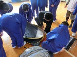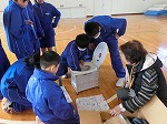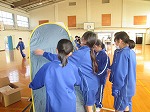 体育館では、リヤカーや簡易トイレの組立を体験しました。