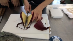 次にはかりを使ってさつまいもの量をはかっています。