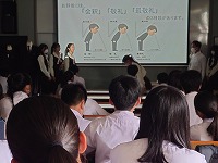 泗商では、「泗商しょう介し隊」の皆さんに出迎えられました。まずは、視聴覚室にて、校長先生から歓迎のお話があり、その後、授業見学と授業体験を行いました。