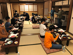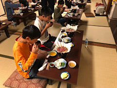 その後、夕食。メニューは、すき焼き、湯葉、ひやむぎ、お漬物、パイナップル。ご飯のおかわりは自由です。みんなよく食べていました。