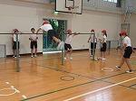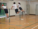 「ピタッと着地できるかな」という課題で、身体を振って着地を意識します。子どもたちは、「あー動いてしまった」「できた!!」と活動に夢中になっていました。